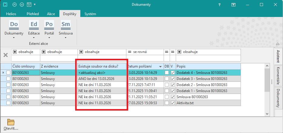 Do přehledu Dokumenty byla přidána informace o existenci souboru na disku.
