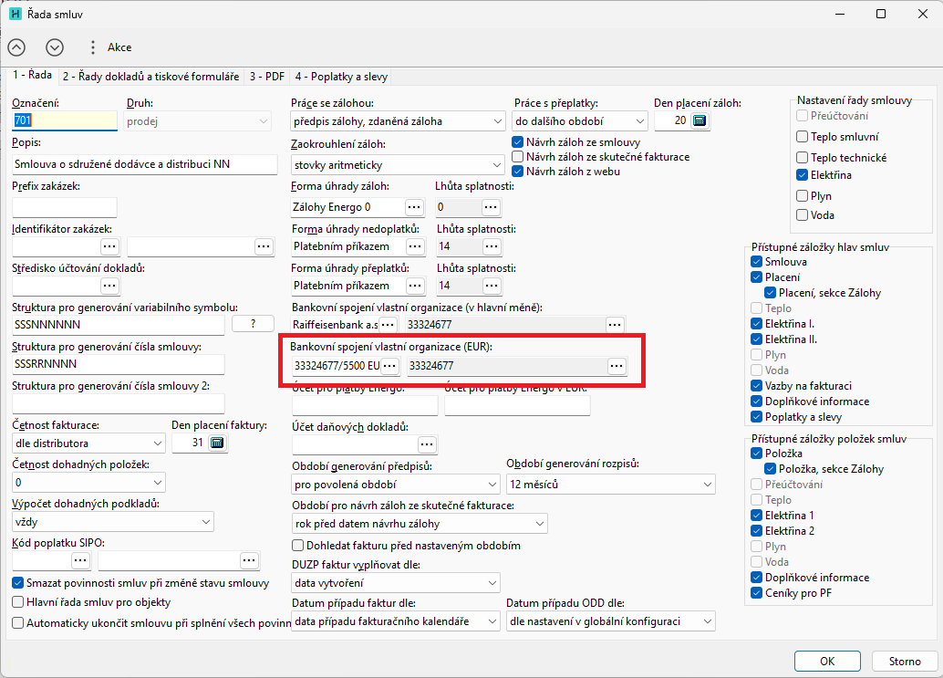 Řada smlouvy byla rozšířena o možnost zadání bankovního spojení v EUR.