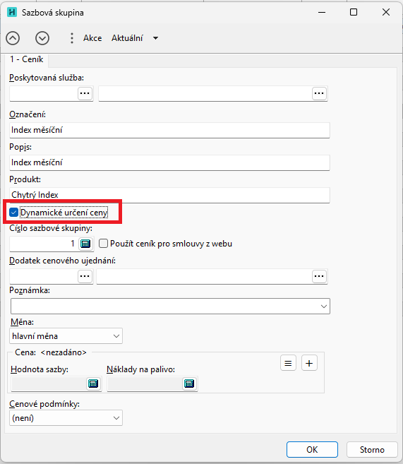 Volba vstupního indexu pro výpočet, nastavení přirážky k ceně a stálý plat se vyplňuje na hlavičce ceníku.